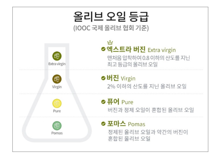 국제 올리브 오일협회(IOC) 에서는 최고등급의 올리브오일 기준을 0.8% 미만으로 정해져 있는데