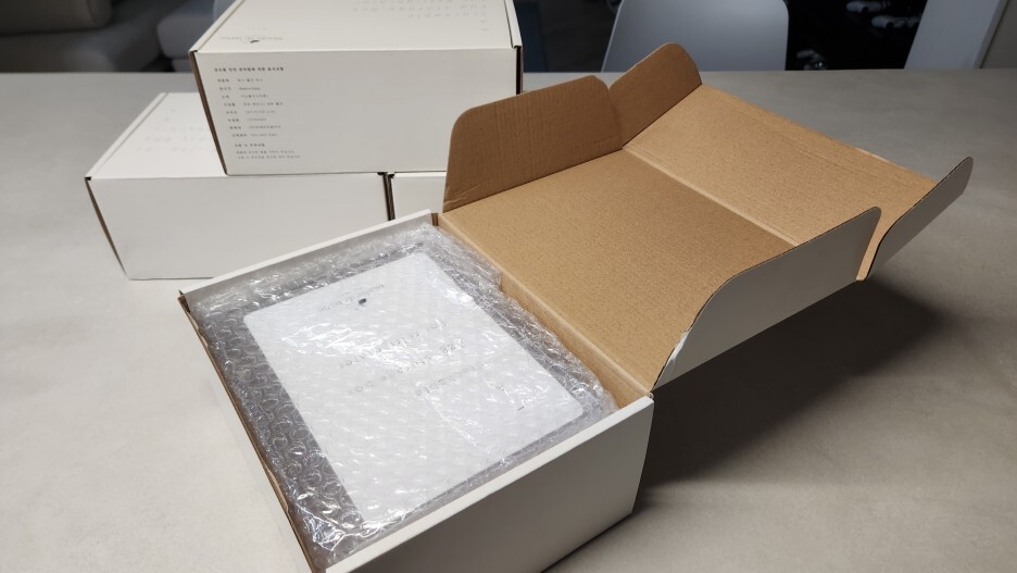 제품은 얇은 비닐포장 되어있고, 주머니형 에어캡에 담겨서 개별 상자 포장이 되어있어요.