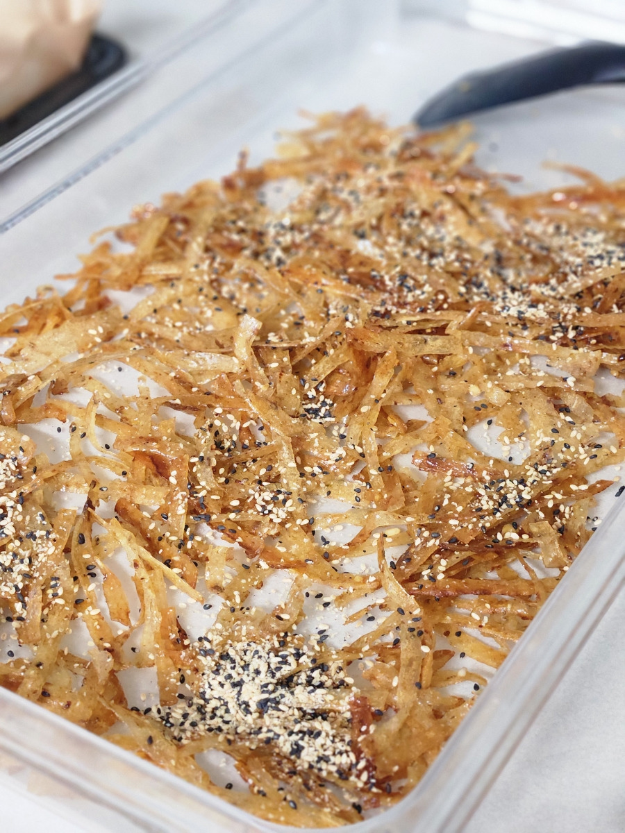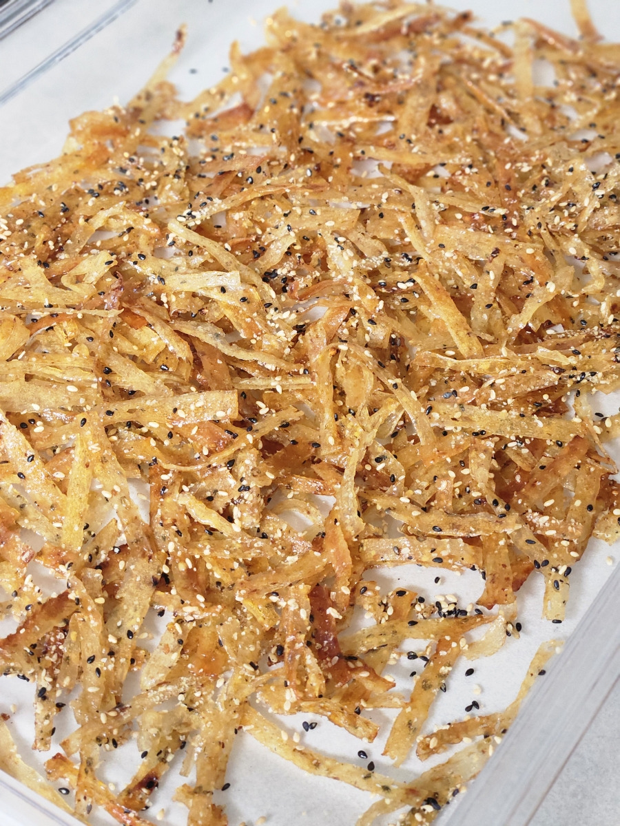 다 볶아진 명엽채는 넓은 트레이에 펼쳐 담고 통깨를 솔솔 뿌려주세요. 이대로 식혀주면 서로 달라붙지 않고 더욱 바삭바삭한 식감이 살아납니다.