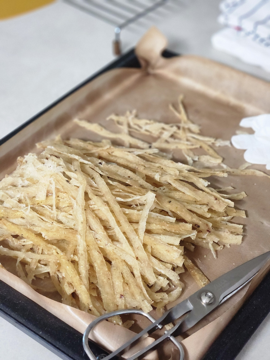 저는 가위로 3등분 한뒤 예열된 오븐 140도에서 15분 수분 날리고 노릇하게 구웠습니다.