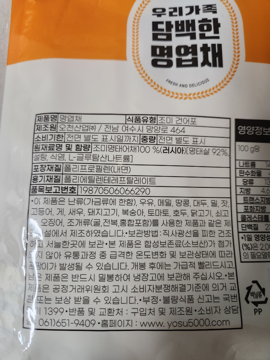 이 제품은 '전분을 섞지 않고 명태살로만 만들었다'는 점이 가장 큰 특징입니다.